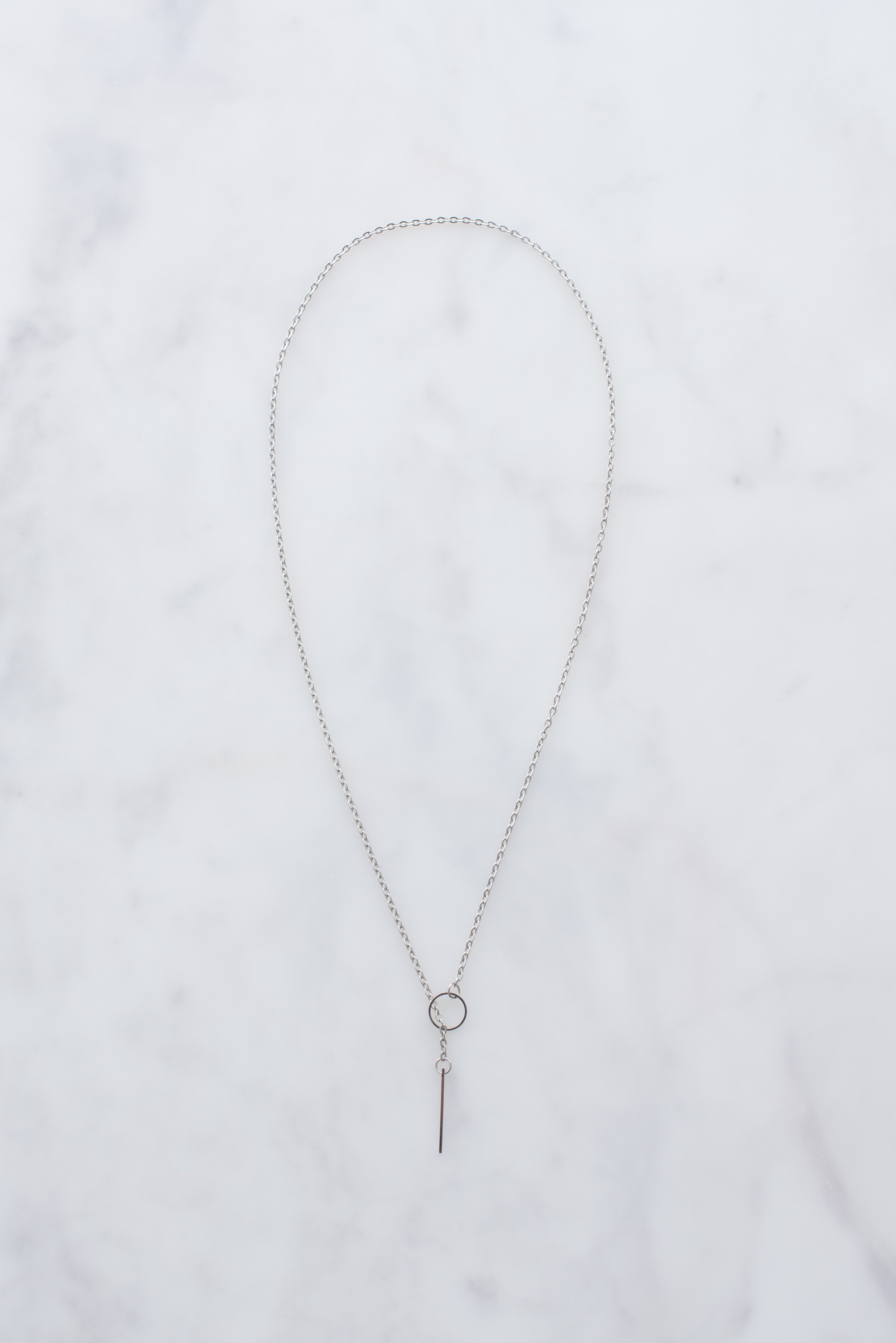 Silver chain thread through circle necklace.